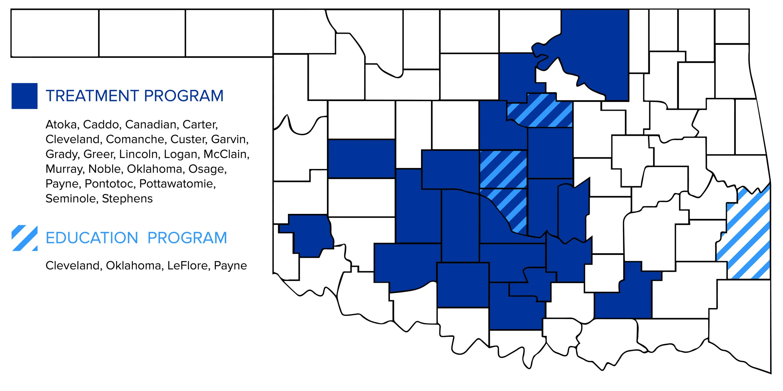 FY23 Clinical program counties served: Caddo, Canadian, Carter, Cleveland, Commanche, Garvin, Grady, Jackson, Kiowa, Leflore, Lincoln, Logan, McClain, Murray, Oklahoma, Pontotoc, Pottawatomie, Seminole, Stephens